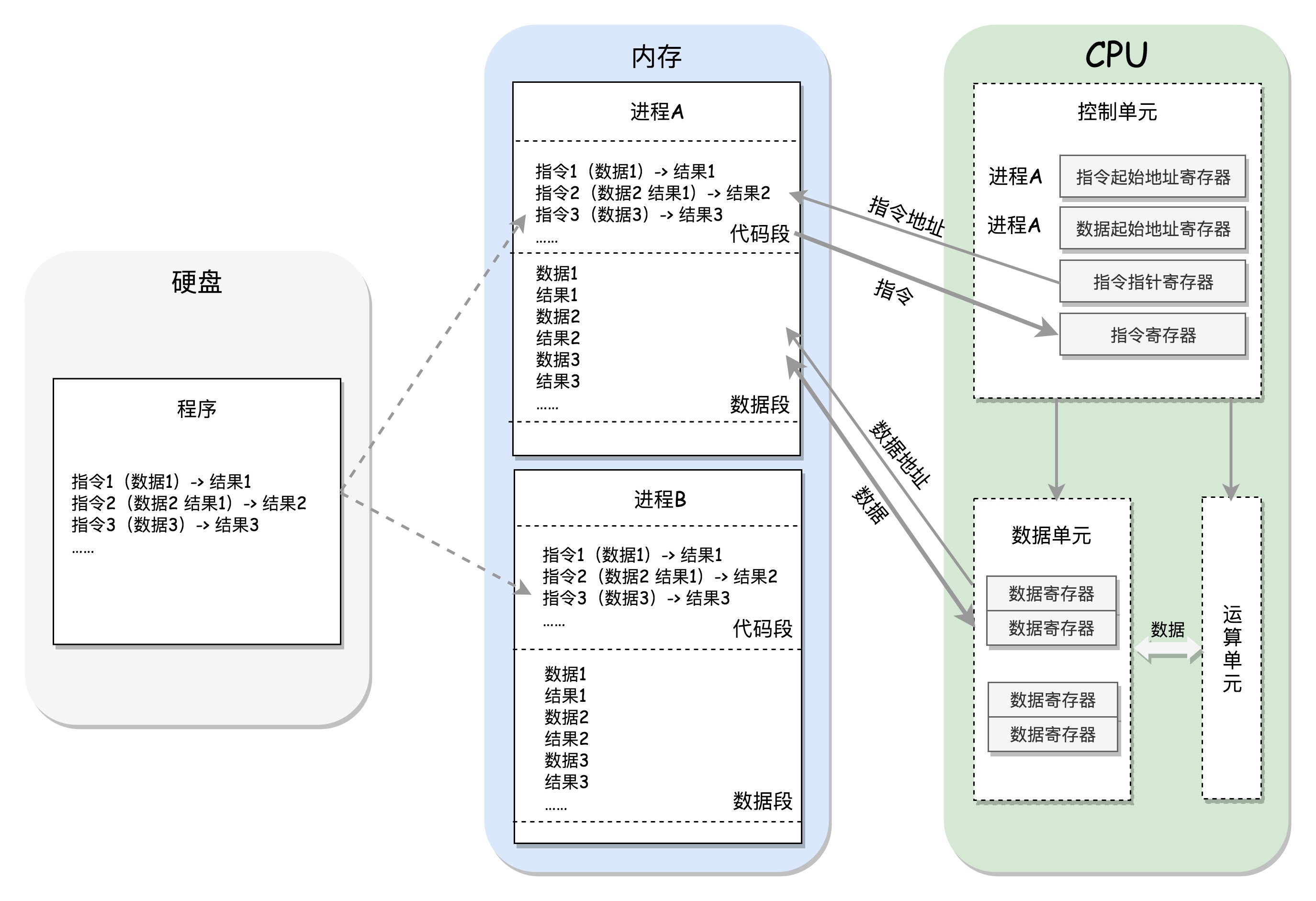 - 数据单元:包括 CPU 内部的缓存和寄存器组,空间很小,但是速度飞快,可以暂时存放数据和运算结果。