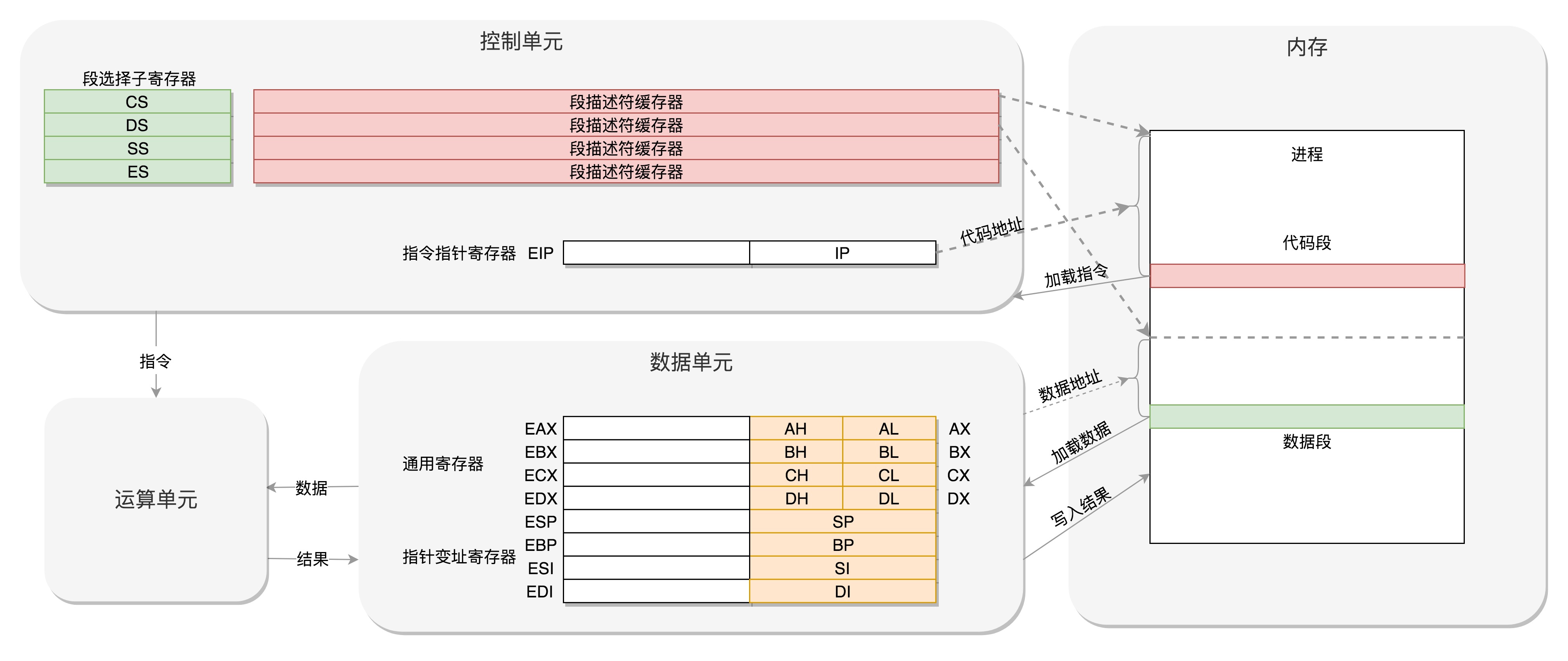 - 代码段的偏移量在IP寄存器里,数据段的偏移量会在通用寄存器里面